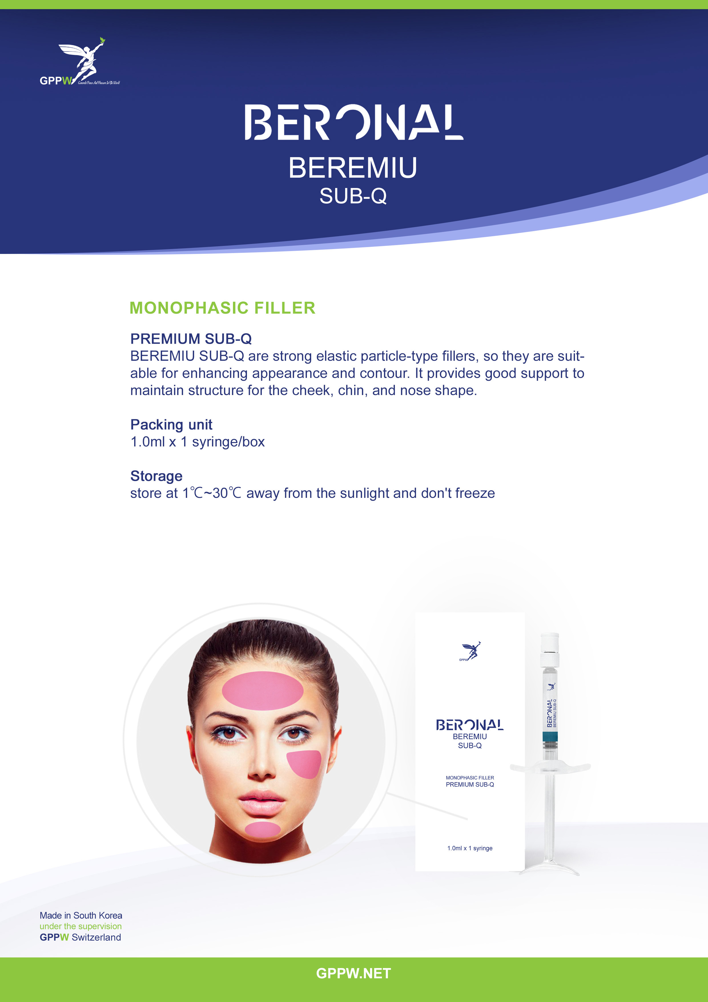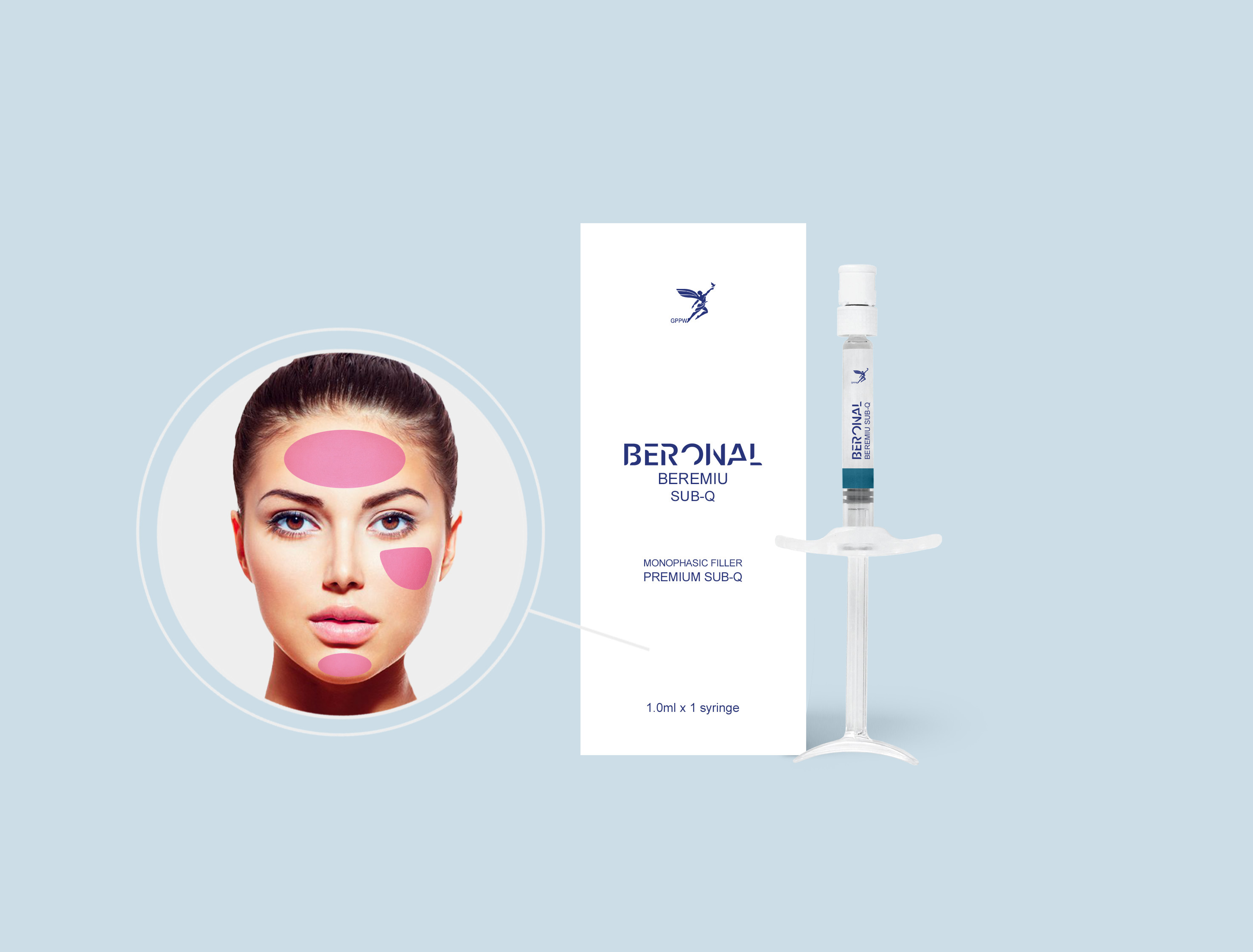 BEREMIU SUB-Q is a strong elastic particle-type filler, so they are suitable for enhancing appearance and contour. It provides good support to maintain structure for the cheek, chin, and nose shape.