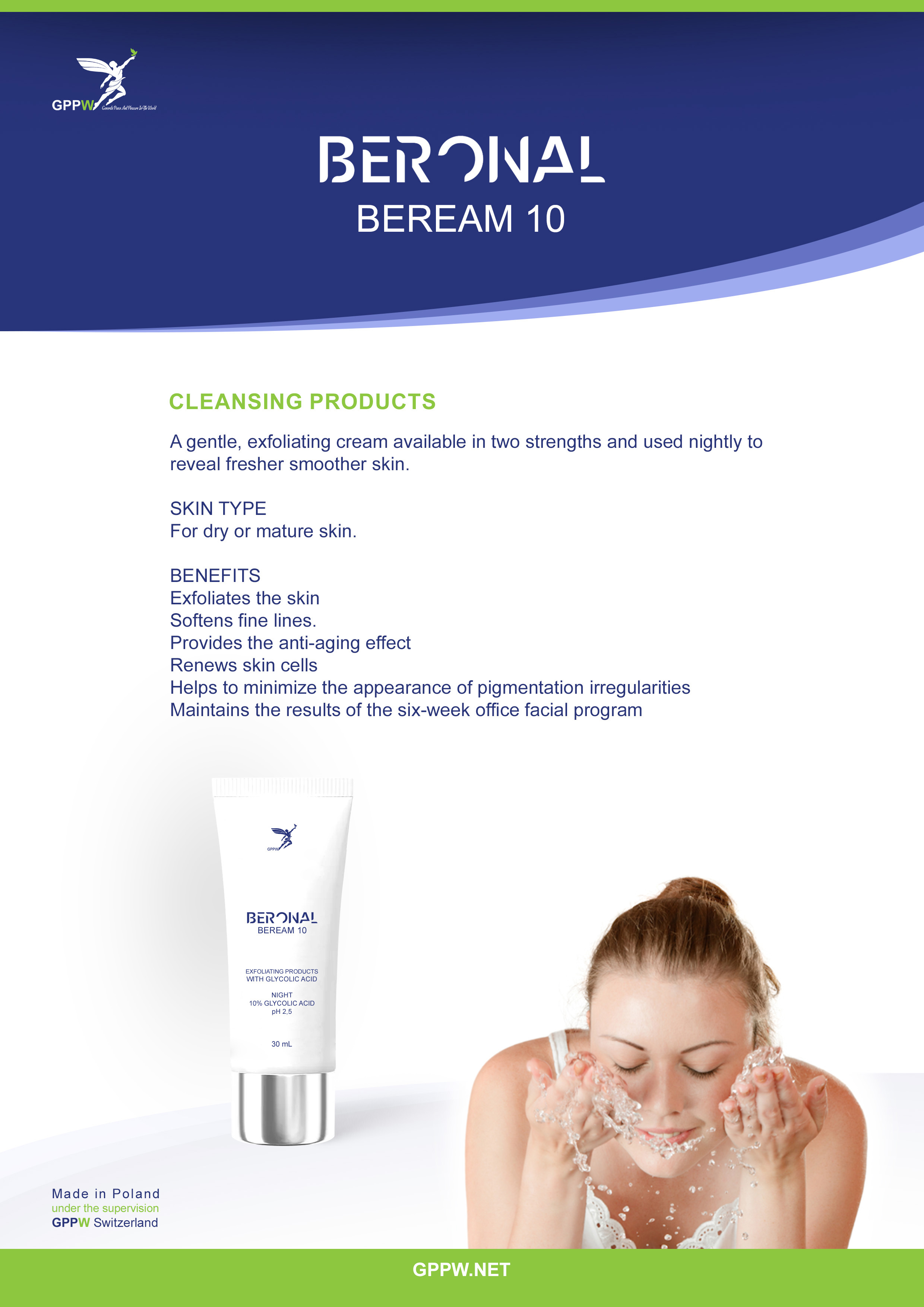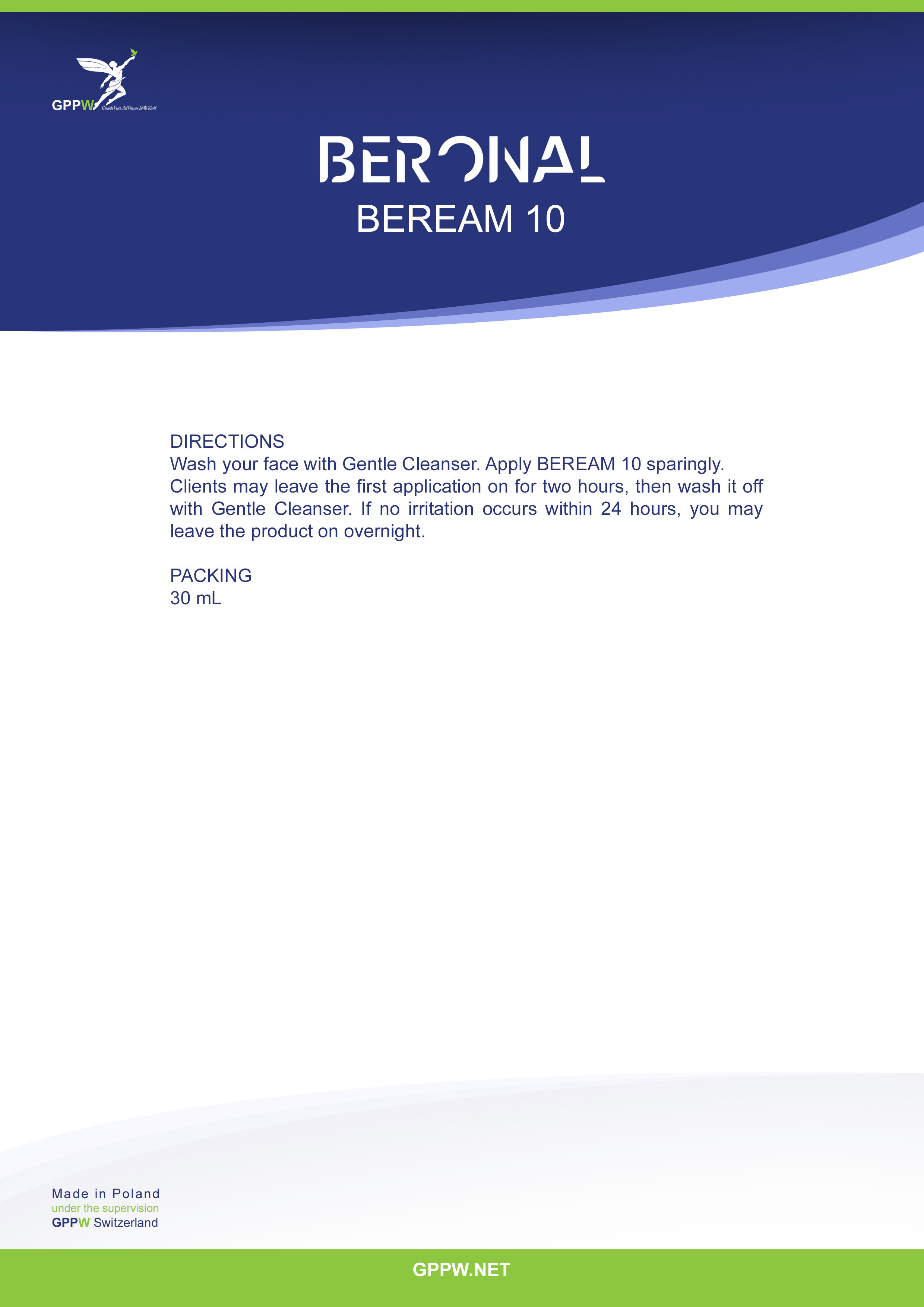 Wash your face with Gentle Cleanser. Apply BEREAM 10 sparingly. Clients may leave the first application on for two hours, then wash it off with Gentle Cleanser. If no irritation occurs within 24 hours, you may leave the product on overnight.