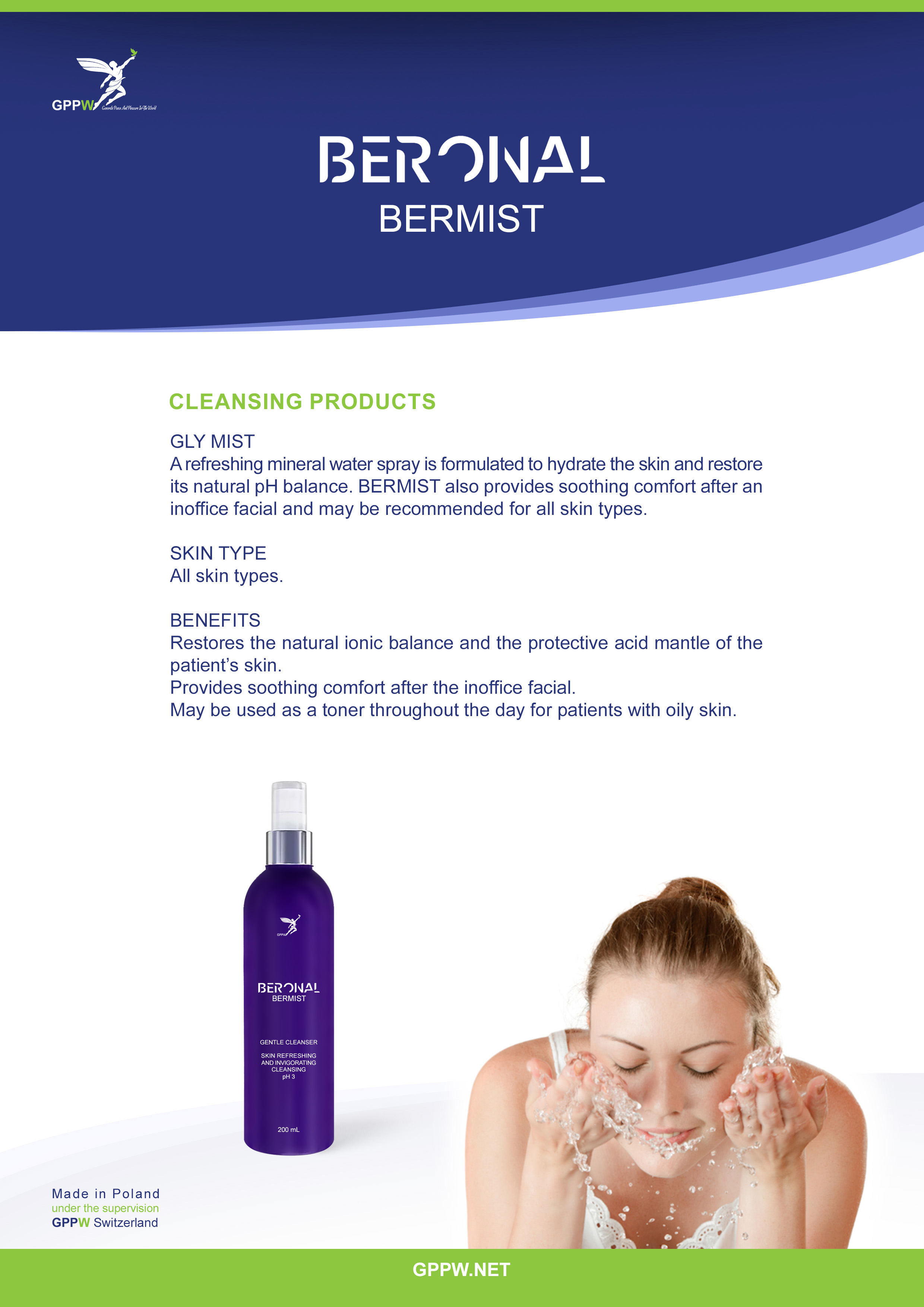 A refreshing mineral water spray is formulated to hydrate the skin and restore its natural pH balance. BERMIST also provides soothing comfort after an inoffice facial and may be recommended for all skin types.