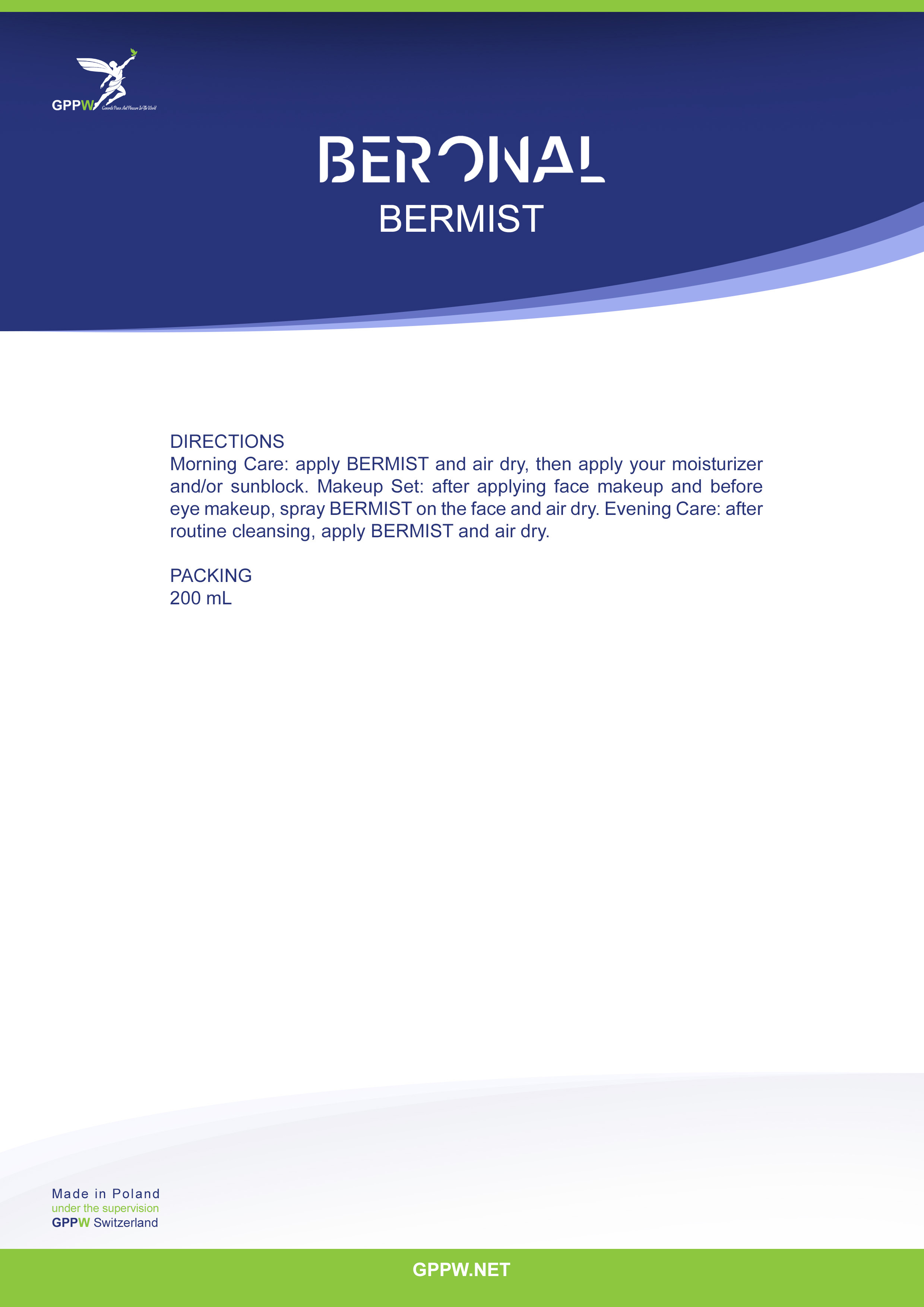 Morning Care: apply BERMIST and air dry, then apply your moisturizer and/or sunblock. Makeup Set: after applying face makeup and before eye makeup, spray BERMIST on the face and air dry. Evening Care: after routine cleansing, apply BERMIST and air dry.