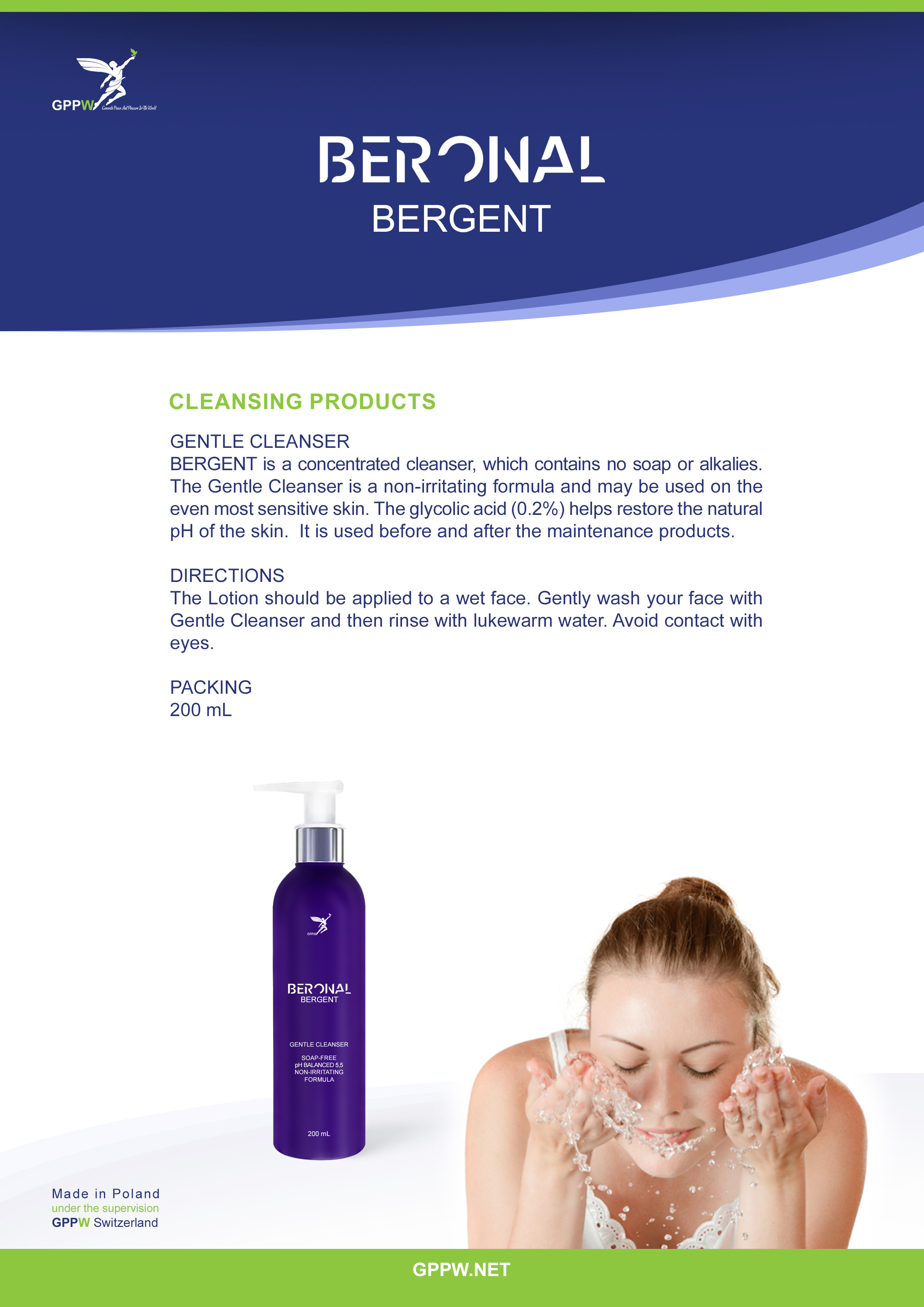 BERGENT is a concentrated cleanser, which contains no soap or alkalies. The Gentle Cleanser is a non-irritating formula and may be used on the even most sensitive skin. The glycolic acid (0.2%) helps restore the natural pH of the skin.  It is used before and after the maintenance products.