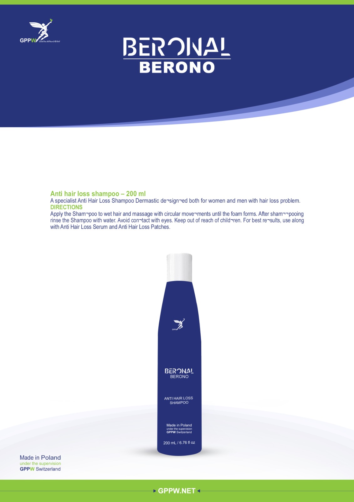 DIRECTIONS Apply the Shampoo to wet hair and massage with circular movements until the foam forms. After shampooing rinse the Shampoo with water. Avoid contact with eyes. Keep out of reach of children. For best results, use along with Anti Hair Loss Serum and Anti Hair Loss Patches.