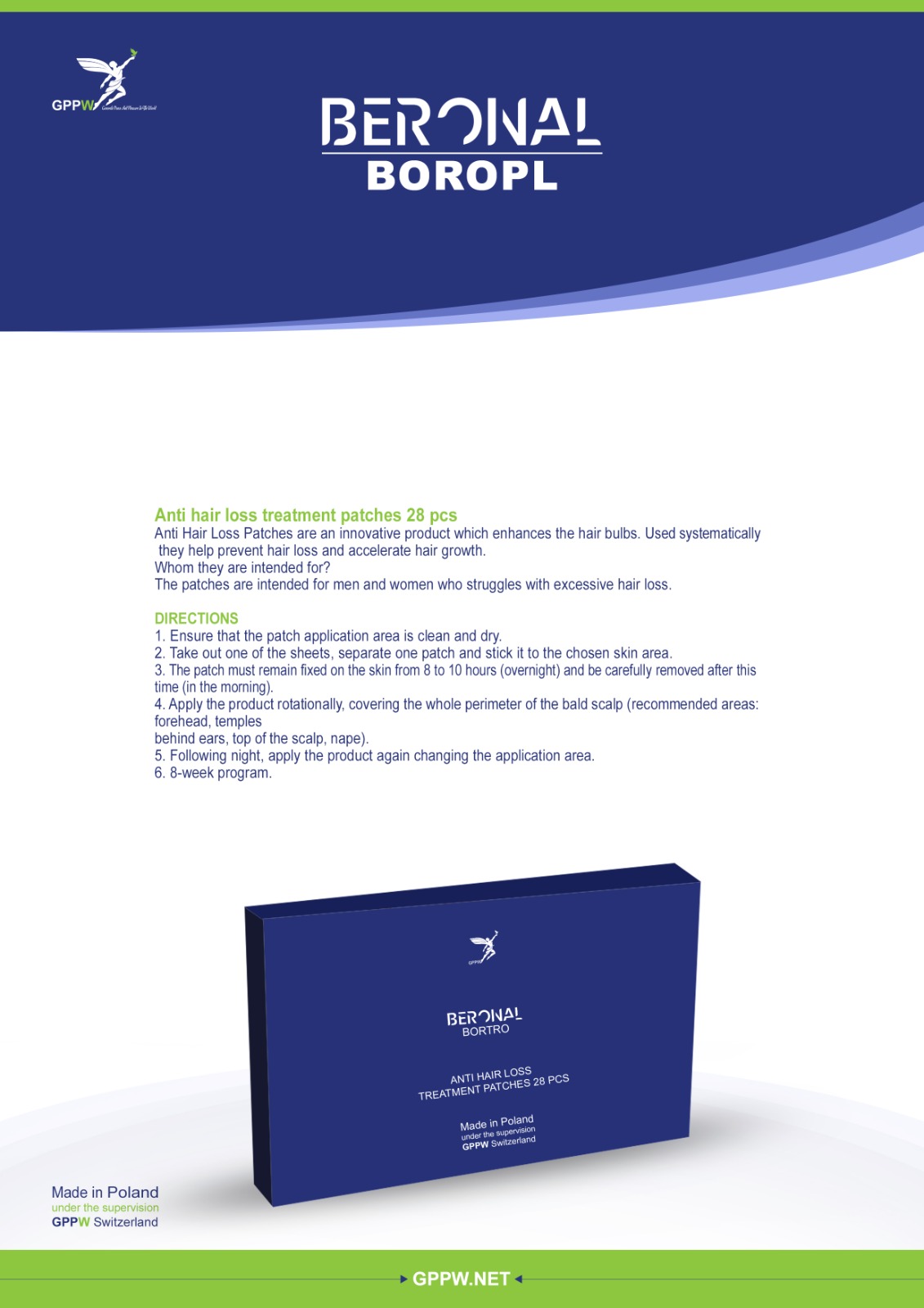 DIRECTIONS 1. Ensure that the patch application area is clean and dry. 2. Take out one of the sheets, separate one patch and stick it to the chosen skin area. 3. The patch must remain fixed on the skin from 8 to 10 hours (overnight) and be carefully removed after this time (in the morning). 4. Apply the product rotationally, covering the whole perimeter of the bald scalp (recommended areas: forehead, temples, behind ears, top of the scalp, nape). 5. Following night, apply the product again changing the application area.