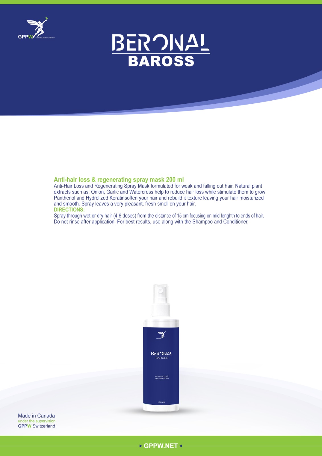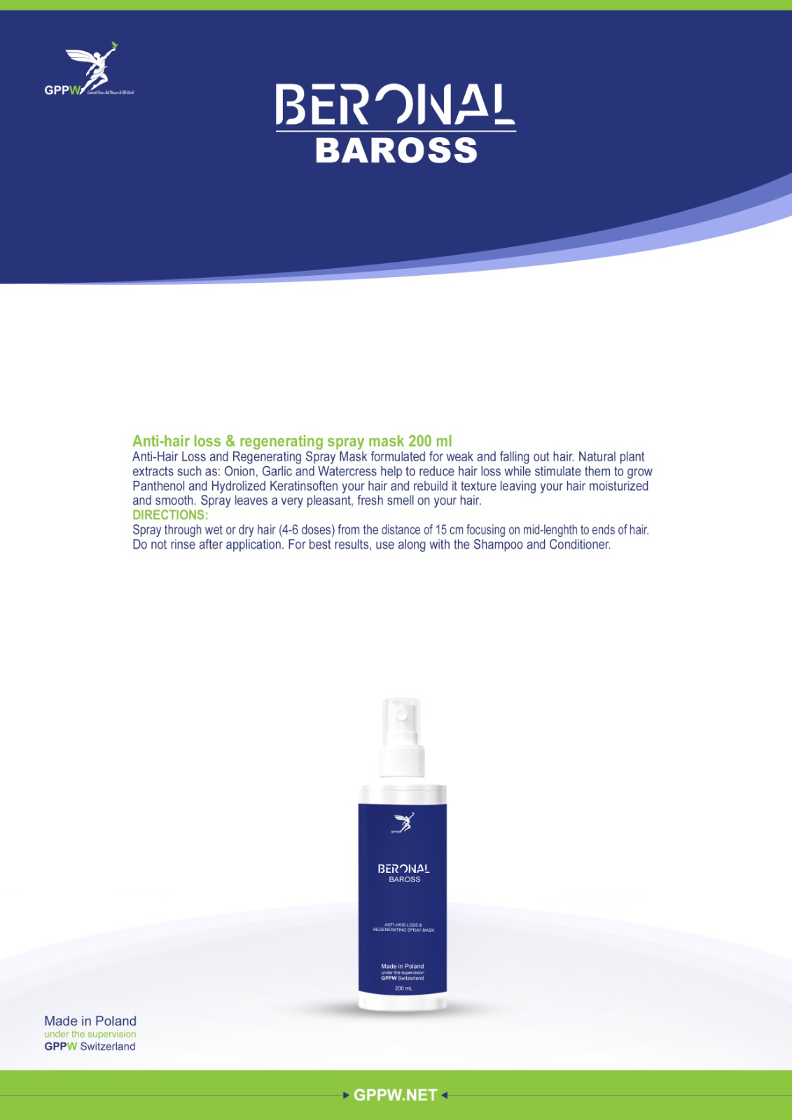 Anti-Hair Loss and Regenerating Spray Mask formulated for weak and falling out hair. Natural plant extracts such as Onion, Garlic and Watercress help to reduce hair loss while stimulating them to grow. Panthenol and Hydrolyzed Keratinsoften your hair and rebuild it texture leaving your hair moisturized and smooth. Spray leaves a very pleasant, fresh smell on your hair.