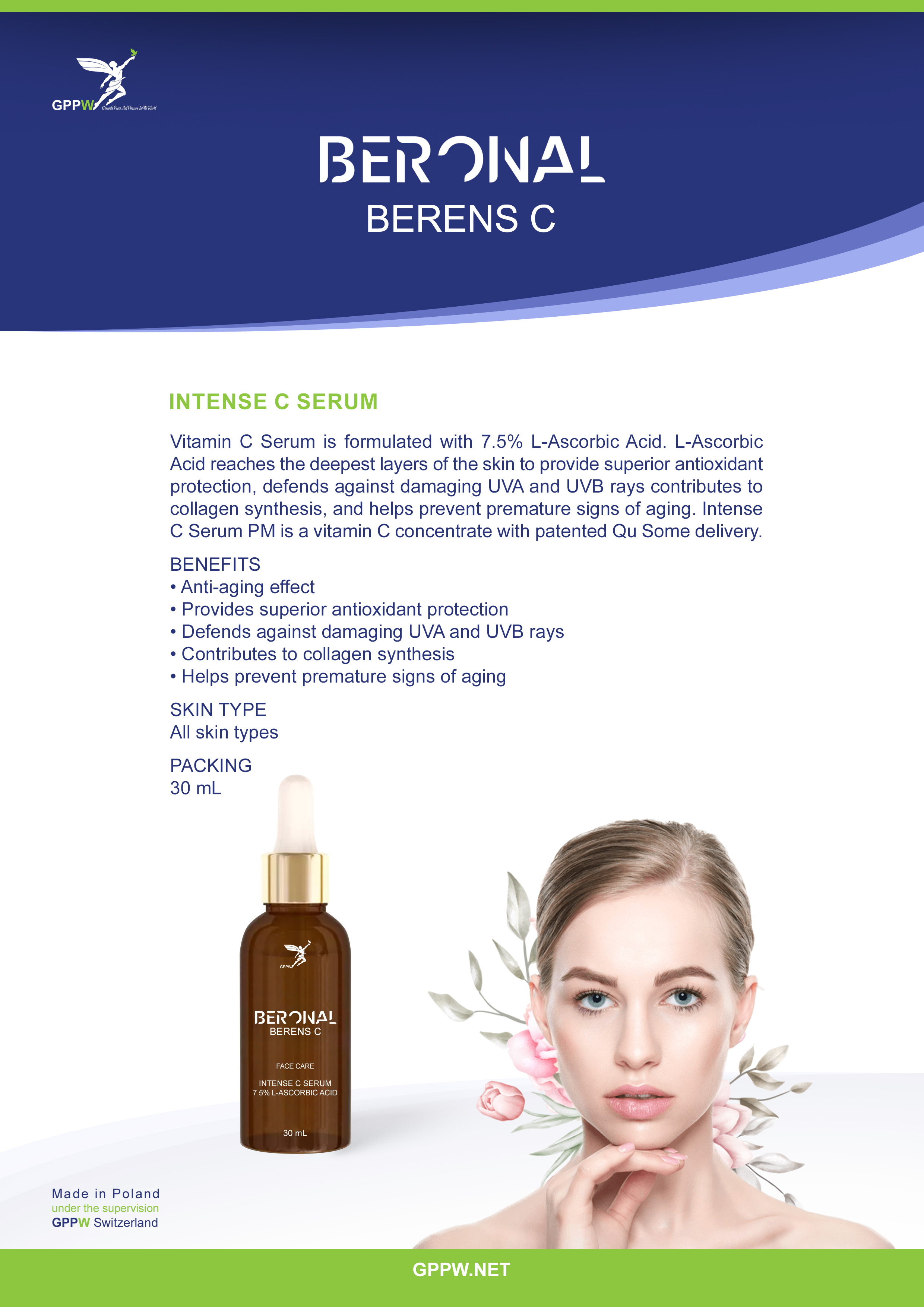 Vitamin C Serum is formulated with 7.5% L-Ascorbic Acid. L-Ascorbic Acid reaches the deepest layers of the skin to provide superior antioxidant protection, defends against damaging UVA and UVB rays contributes to collagen synthesis, and helps prevent premature signs of aging. Intense C Serum PM is a vitamin C concentrate with patented Qu Some delivery.
